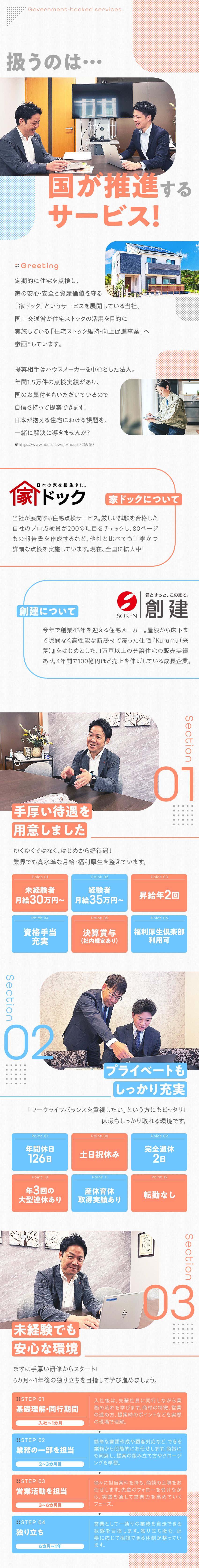 近年は、住宅点検サービス「家ドック」にも注力し、住まいの安心と長寿命化を実現する取り組みを強化。国の支援対象にも選ばれ、メディア露出も増えるなど、サービスへの注目度が一段と高まっています。まさに成長の真っただ中にあるサービスで、全国展開が進む今、自信を持って営業活動に取り組める環境と言えるでしょう。