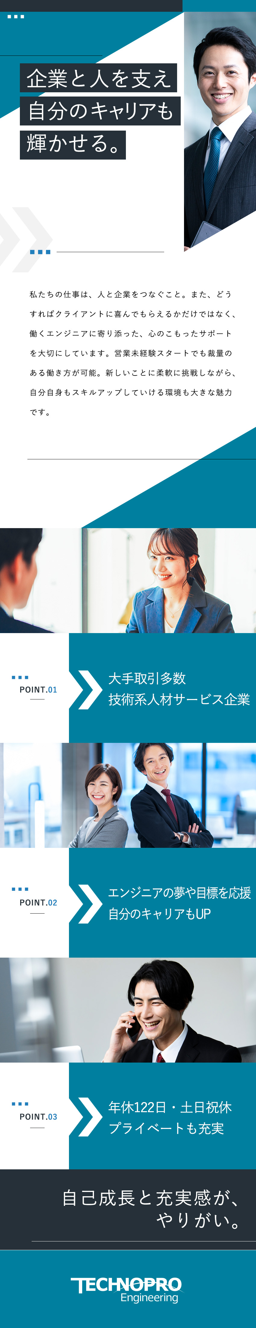 テクノプログループの安定性に加え、年間休日122日、土日祝休、残業は20時間程度と自分の時間もしっかり確保。ワークライフバランスを重視したい方も満足できる環境です。