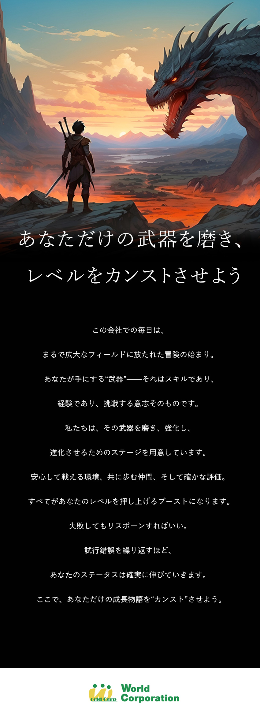 前職では製造現場の仕事で毎日同じルーチンワークでした。定年までこの仕事はしたくないと思い、転職でワールドコーポレーションへ。自分で考えたり、アイデアを活かすワークスタイルなので刺激的な毎日です!