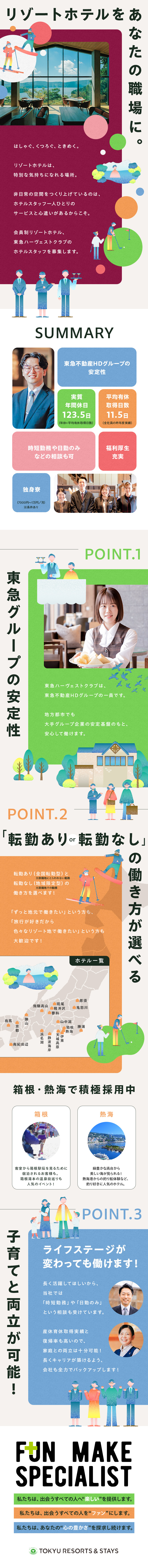 全国各地の自然豊かな場所でリゾート施設を運営しているので、自然と近い場所でのびのびと働くことができます。同社ならではのお客さまに寄り添った接客を活かすことはもちろんのこと、業務オペレーションの確立など学べることはたくさんあります。都会の喧騒から離れた場所で、自然を楽しみながらさまざまな経験を積みたい方にとって、多くのやりがいを感じられるでしょう。