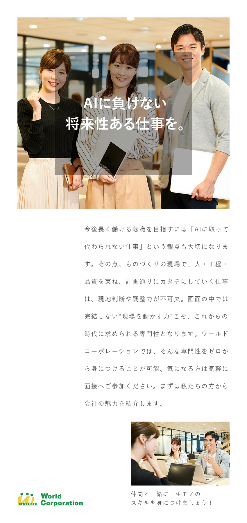 前職では製造現場の仕事で毎日同じルーチンワークでした。定年までこの仕事はしたくないと思い、転職でワールドコーポレーションへ。自分で考えたり、アイデアを活かすワークスタイルなので刺激的な毎日です!