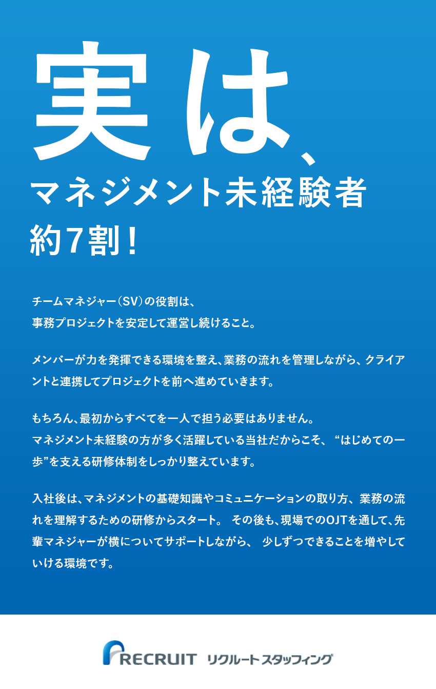 リクルートスタッフィングでは、未経験の方が安心してスタートできるように、基礎から身につけられる研修やマニュアル、フォロー体制などの育成環境を完備。スキルに自信がない方でも、チャレンジできる環境が整っています。