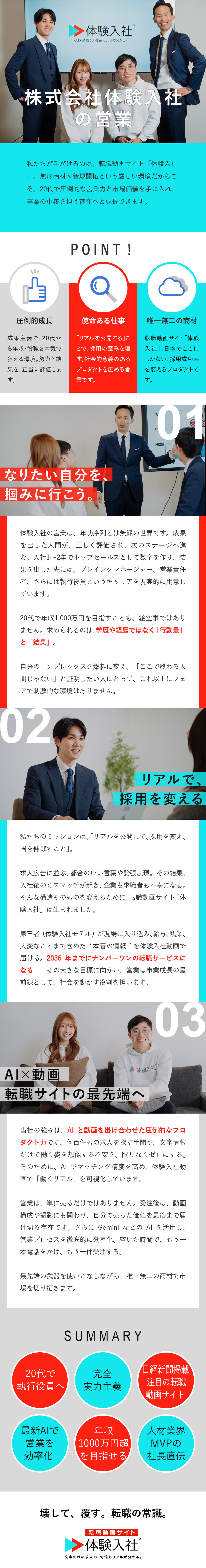 【成果重視】20代で執行役員や年収1000万円超へ/【商品力】独自性が高い 転職動画サイト「体験入社」/【メディア注目】日本経済新聞掲載の転職動画サイト/株式会社体験入社