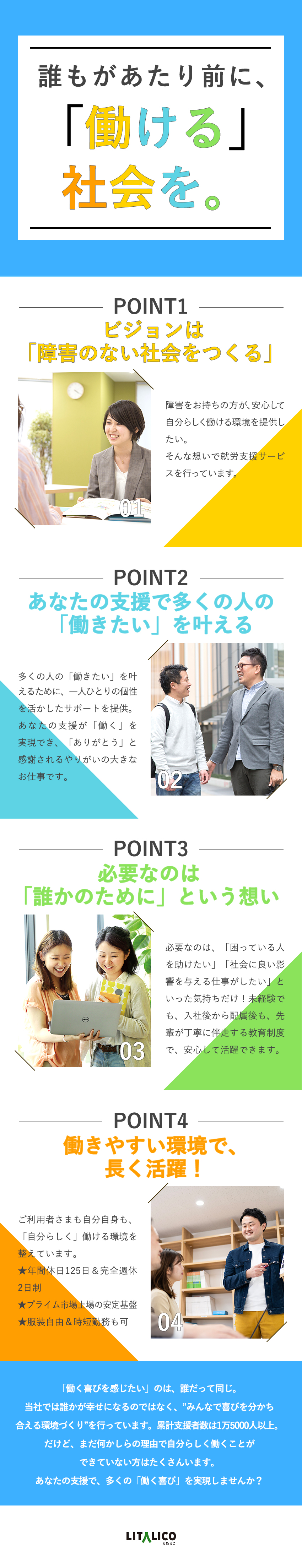 LITALICOワークスの仕事は、このビジョンを「働く」という場面で実現する最前線です。その人が持つ素晴らしい力や個性が、社会の画一的な「働き方」という仕組みによって発揮できずにいる状況を変えたいのです。