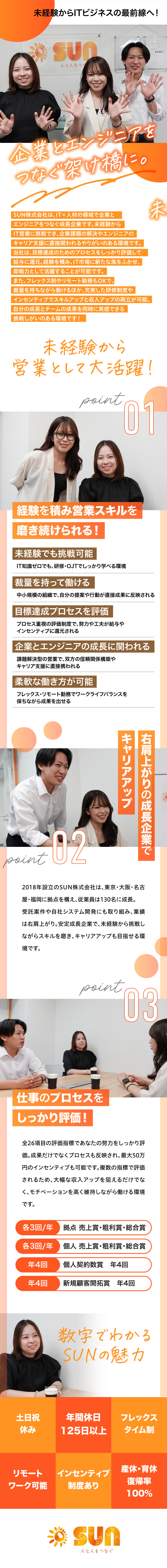 SUN株式会社は現在、事業拡大に伴い営業組織を強化中。直近では20代メンバーの採用が進み、若手が中心となって活躍しています。IT業界未経験からスタートした社員も多く、前職は不動産、接客、販売など異業種出身者が多数。これまでの営業経験や対人スキルを活かしながら、IT知識は入社後に身につけられる環境です。リモートワークやフレックスタイム制度も取り入れ、柔軟な働き方を実現。お客様との信頼関係構築を大切にする営業スタイルのため、誠実に成長したい方に最適です。拡大フェーズだからこそ、ポストや裁量のチャンスも豊富です。