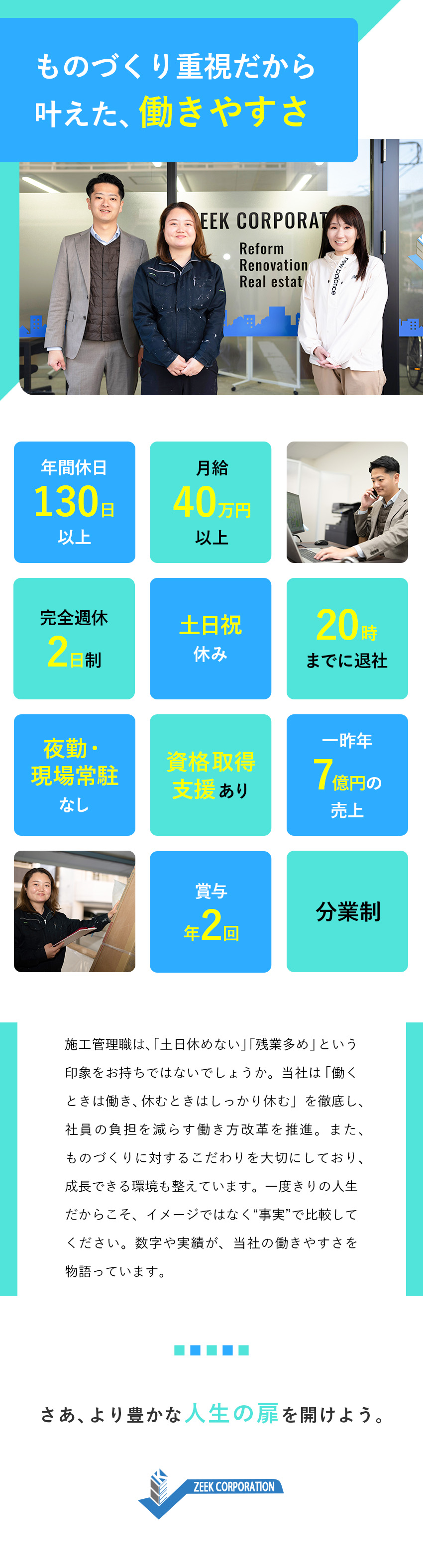 施工管理/経験者歓迎/月給40万円~/年休130日/土日祝休
