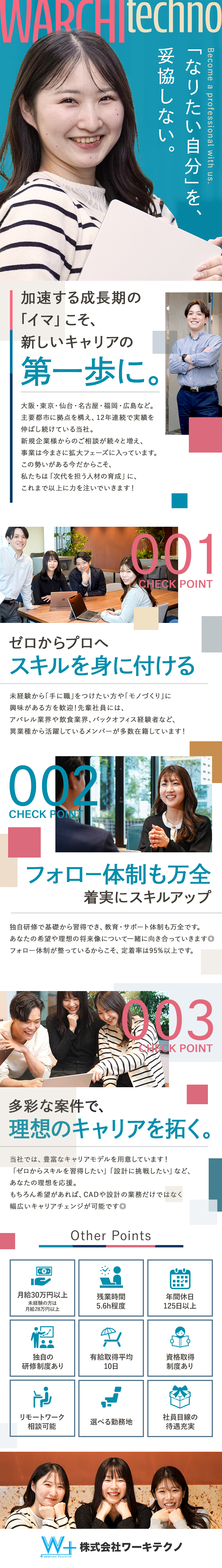 クライアントの多くは上場企業で、業績も順調に成長し売上は右肩上がり。その中で、未経験から様々な職へスキルアップする社員が多く生まれている背景には、ワーキテクノに根付いた考え方があるそうです。それは社員一人ひとりの5年後、10年後のキャリアを見据え、将来必要なスキルと、今どんな経験を積むべきかを真剣に考えること。もちろん社員の希望を無視することはないそうで、年齢や周りの環境など様々な要因によって状況が変化する中、柔軟に対応できるように日々のコミュニケーションを一番大切にしているとのこと。一人ひとりに向きあっているからこそ業績も社員数もどんどん伸びているんですね。