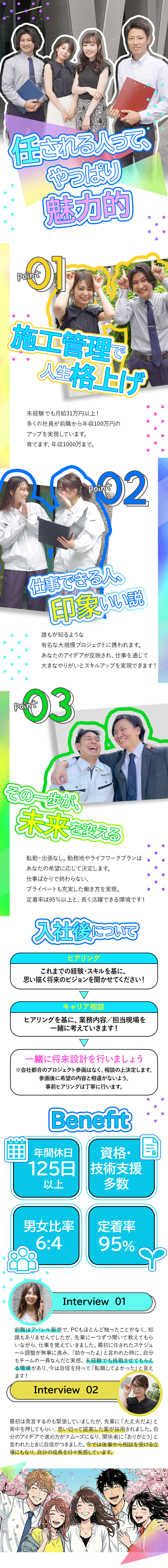 業界未経験の方は勿論、建築・土木・設備(空調・衛生・電気)のご経験者や大工や鉄筋工、解体や道路/上下水道から墨出し/測量専任の職人まで、各工事経験者が在籍しております。