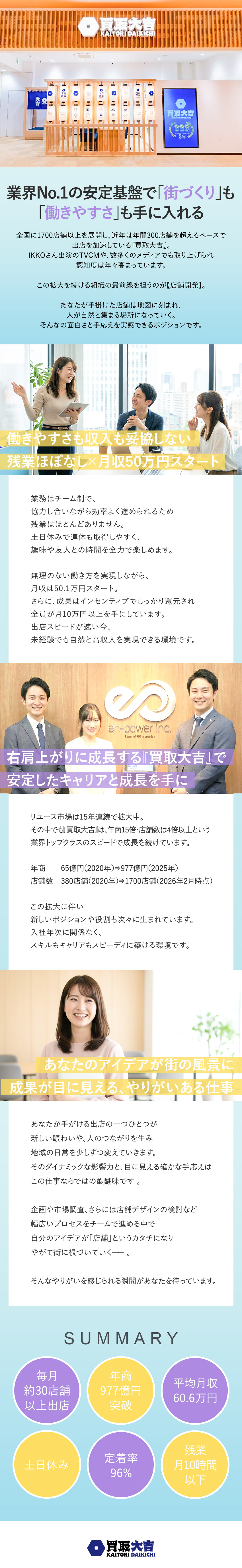 あなたの仕事の成果は、「店舗」という形で街の地図に刻まれていきます。一つひとつの店舗が、多くのお客様を笑顔にする場所となる。その達成感を、肌で感じられる仕事です。