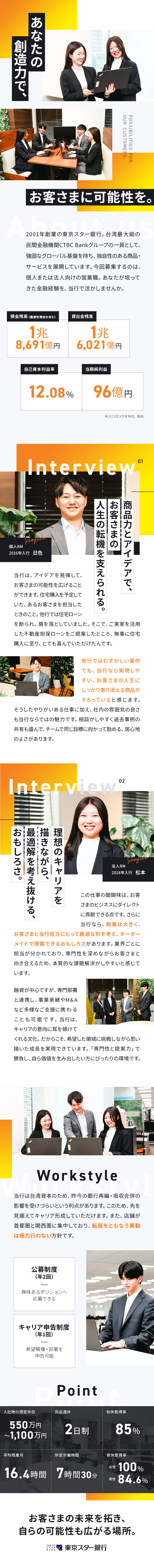 金融営業(個人・法人)/有休取得率85%/月給35~55万円
