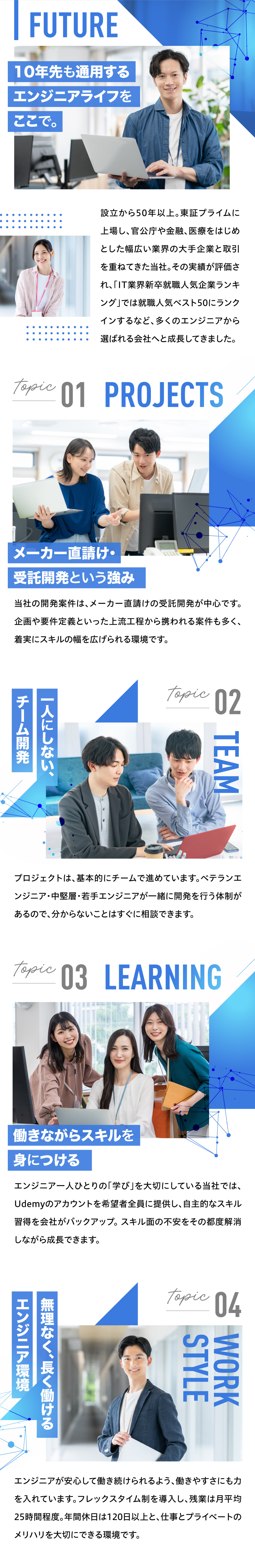 メーカー直請けの受託開発が中心なので、企画・要件定義等の上流工程から関われる案件も多く、高いスキルを磨けます。