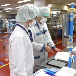 工場内で見本写真を見ながら、食品をトレーにセットしていく作業が中心です。