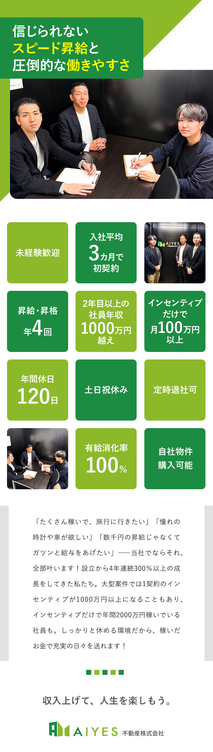 当社は未経験から年収1000万円を超えている社員がほとんど。今回の募集は経験不問ですので、「稼ぎたい」「人生を変えたい」といった強い想いのある方はぜひ応募ください。お会いできるのを楽しみにしています。
