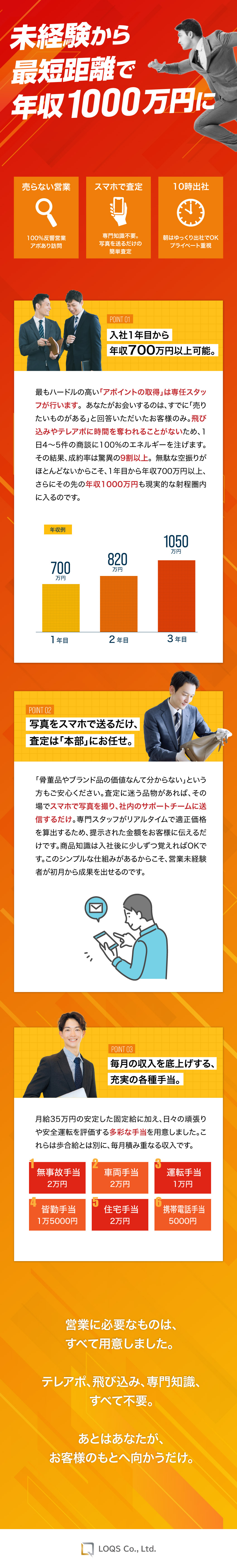 最大のやりがいは、努力がダイレクトに跳ね返る「収入」です。成約率9割というハードルの低さにより、未経験からでも入社初年度から年収600万円以上を実現できる環境があります。また、お客様にとっては「不要なものがお金に変わる」経験となるため、感謝の言葉をいただける機会が非常に多いのも特徴です。自分の工夫がインセンティブとして可視化されるため、高いモチベーションを維持できます。