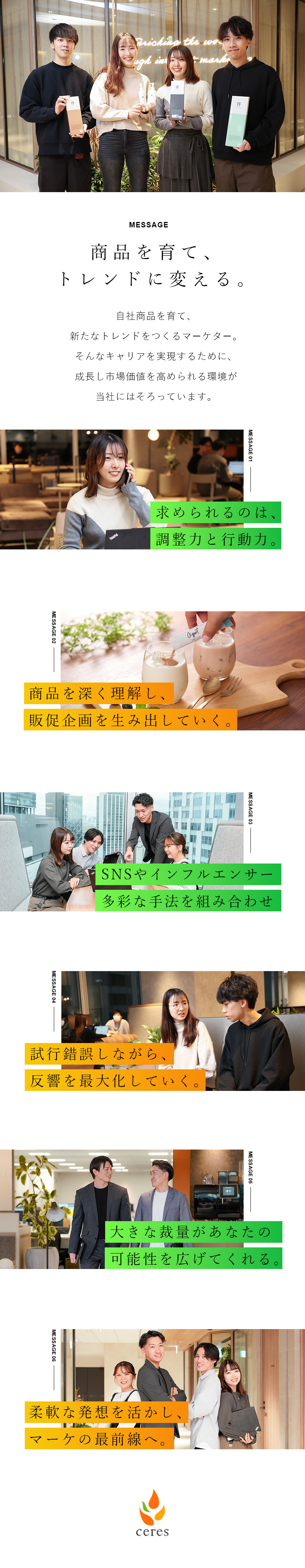「自社商品の売上を上げるためには」という視点から、プロモーション施策やチャネル、PR方法まで一貫して担当可能。特に広告運用などの経験をお持ちの方であれば、数値に向き合う経験を活かしつつ、より自由な発想を活かすことができるはずです。