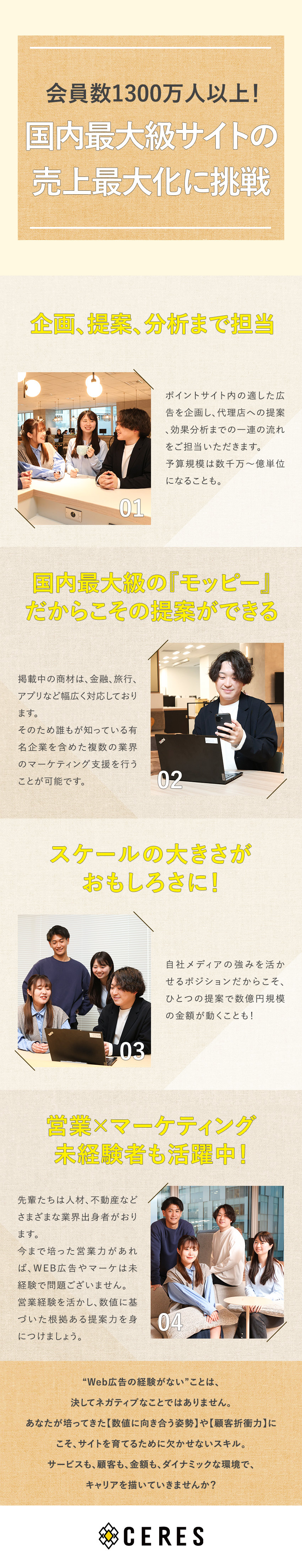 【自社メディアの広告営業・マーケティング】会員数1300万人超の『モッピー』など/業界未経験OK◎