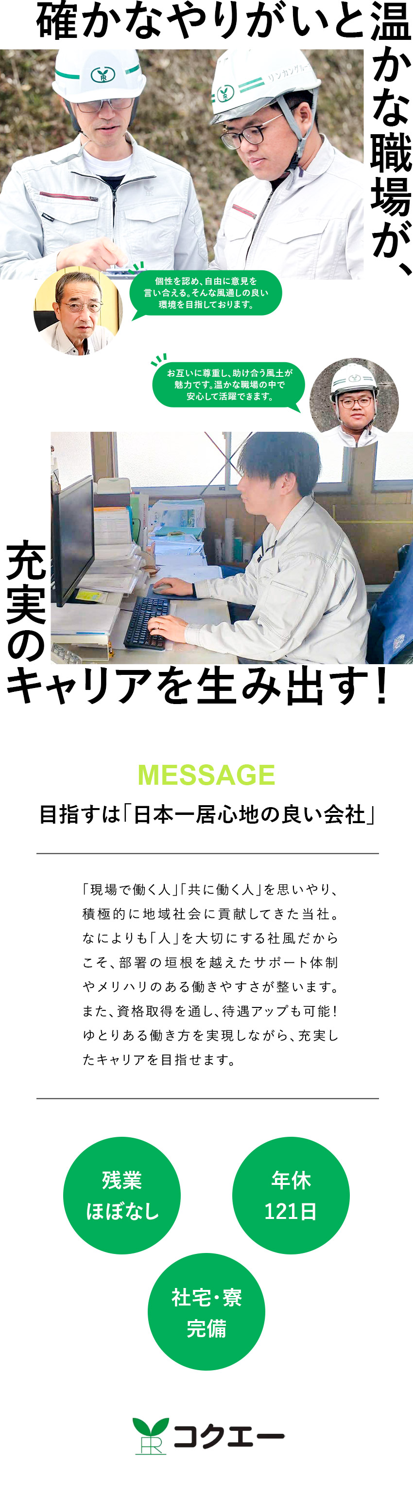 施工管理/年休121日/転勤なし/残業基本なし/前職給与保証