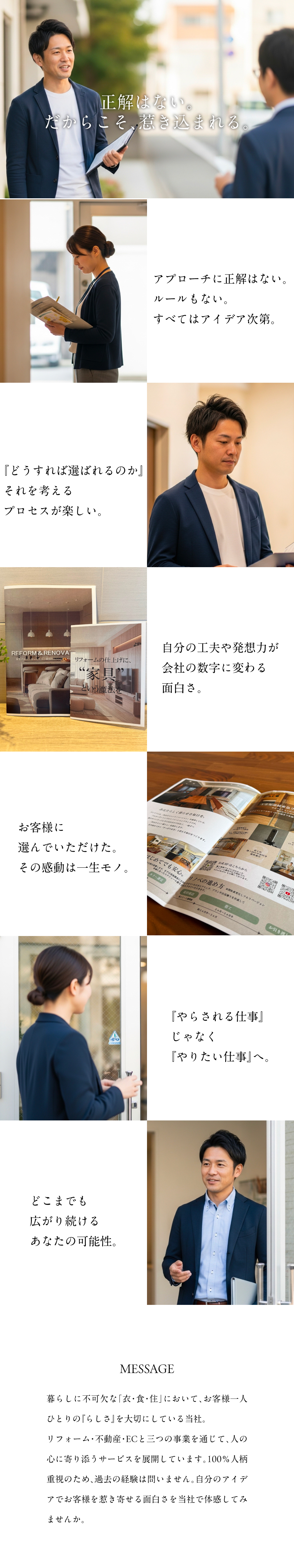 同社が大切にしているのは、お客様の「らしさ」を空間づくりで表現すること。単なるリフォームではなく、想いや暮らしに寄り添うことが大前提。営業やマーケティングも、その価値を届ける案内人であり立役者。誰かの理想の暮らしに関われる実感が、日々の仕事のやりがいにつながっています。