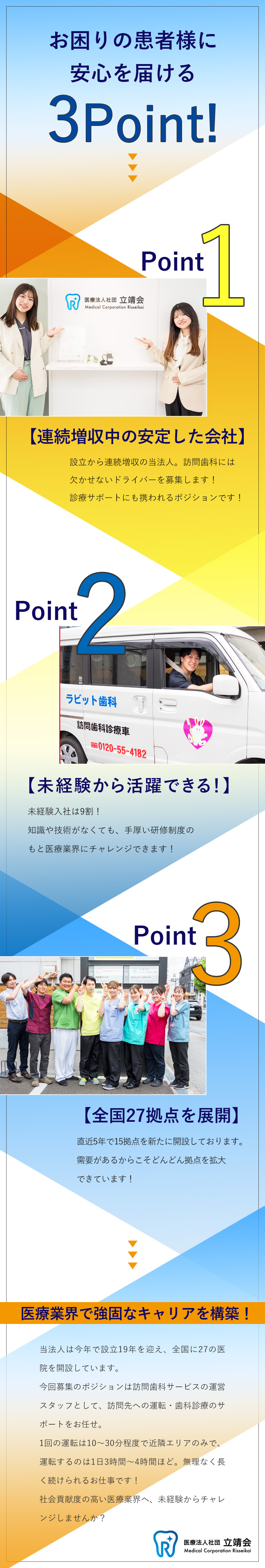 当院は訪問歯科診療をメインの事業としており、半年ごとのペースで診療所を増設予定。安定した環境で、未経験から医療業界に携われる本ポジションなら、自身のスキルアップもキャリアアップも叶います!