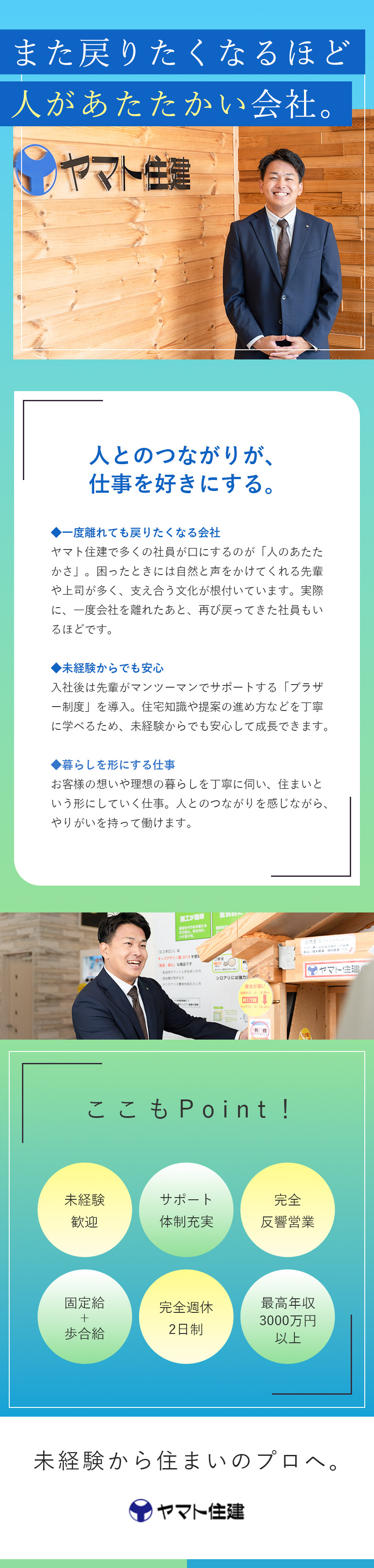「この家にしてよかった」「あなたにお願いしてよかった」と感謝の言葉をいただけた時の喜びは格別です。ヤマト住建の住宅は高い性能を備えた世界水準の住まいであり、自信を持って提案できる商品力があります。お客様の住まいを一緒に形にしていく過程そのものが大きなやりがい。さらに、頑張った分はインセンティブとして収入に反映されるため、人のために努力した結果が目に見える形で帰ってくる仕事です。
