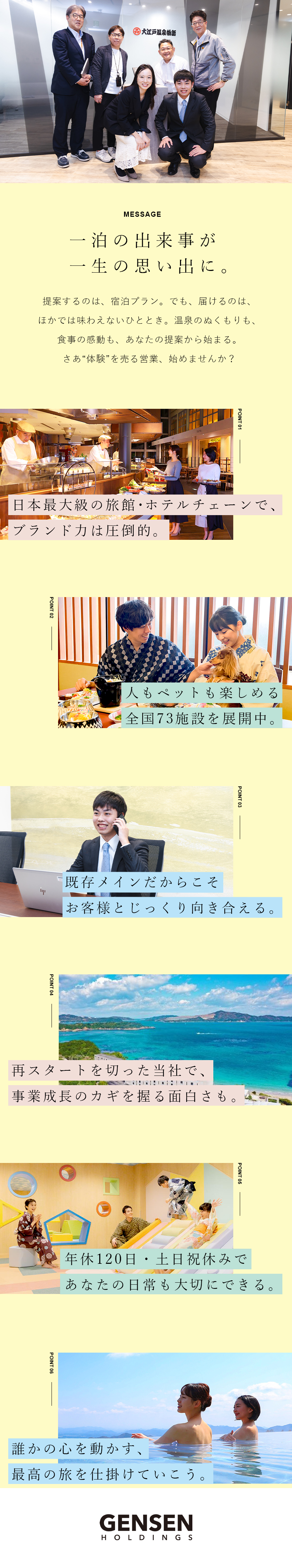 圧倒的知名度の高さとクオリティも兼ね備えている同社。ゆえに旅行代理店からのニーズも高く、成果を上げやすいのが大きな魅力です。新体制になり、さらなる成長フェーズへと進んでいる段階ですので、自分の営業力で会社の未来を切り拓いていく面白さも!『モノ』を売って終わりの営業ではなく、一生心に残る『体験』を提案していくやりがいは、無限大です◎