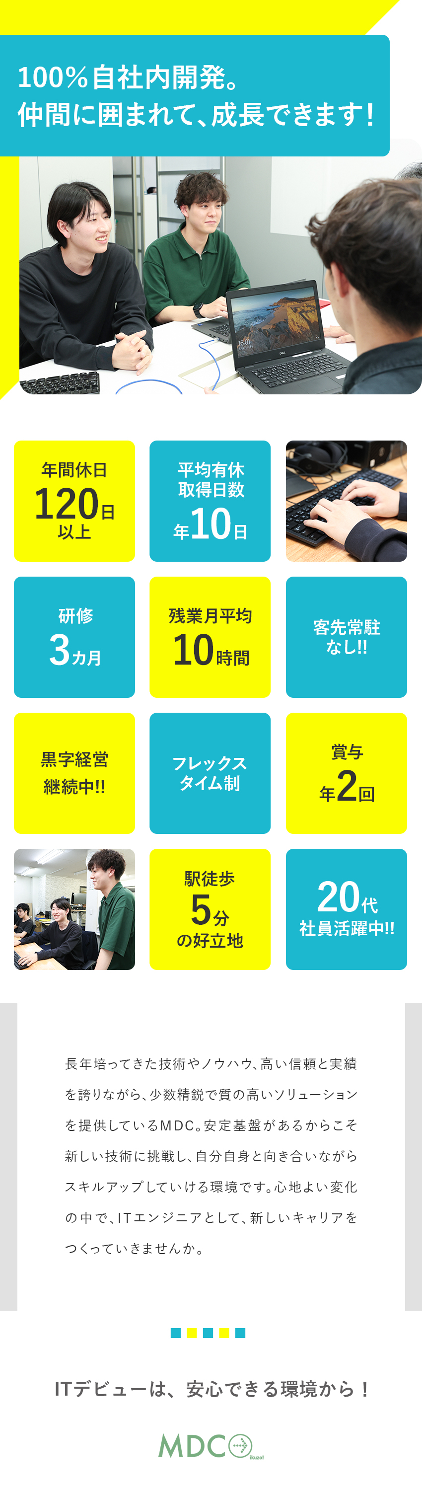 建前ではなく完全に未経験募集、ポテンシャル採用です。ニーズの高い業界で働きたい、エンジニアとして手に職をつけたい、学ぶ環境さえあれば頑張れる、そんな意欲のある方であれば活躍できると思います!