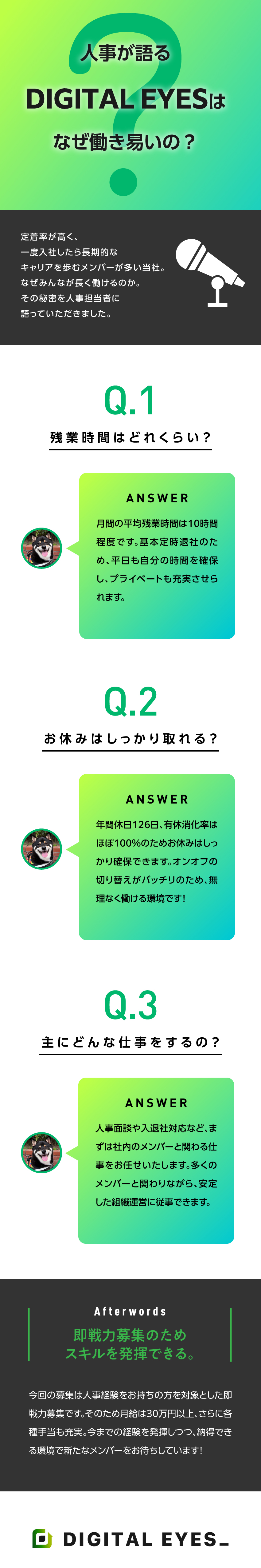 残業は月10時間以下と少なく、年間休日も126日と十分なため、無理なく働きながら人事としての実務を積み重ねていける環境だと感じました。