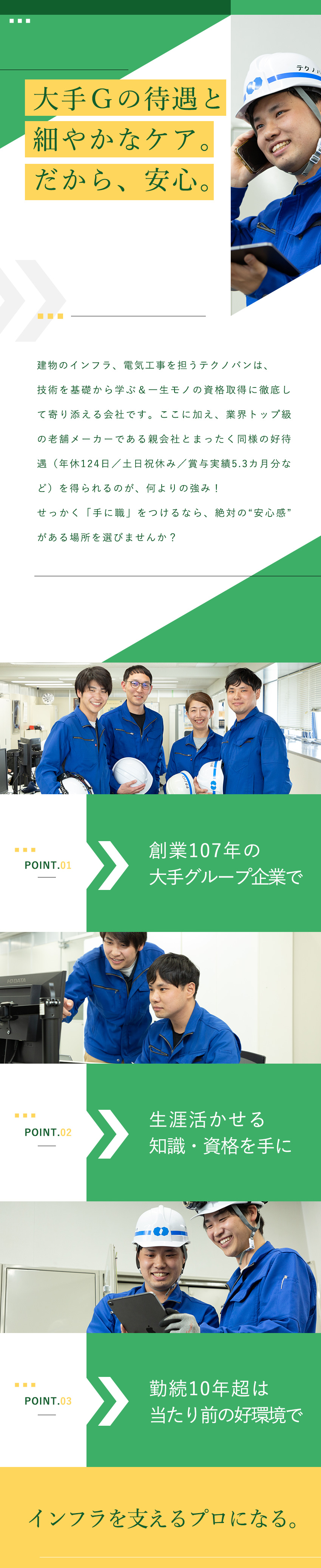 電気工事スタッフ/未経験歓迎/年休124日/賞与5.3カ月分