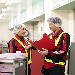 自社工場で製造した機内食(ミール)のチェックから引継ぎ、搭載まで、時間を意識しながら対応します。