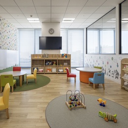 また、景色が望める明るい託児所を併設。休憩室からお子様の様子を確認できる大きなガラス窓を採用するなど、安心して業務に集中できる環境です。