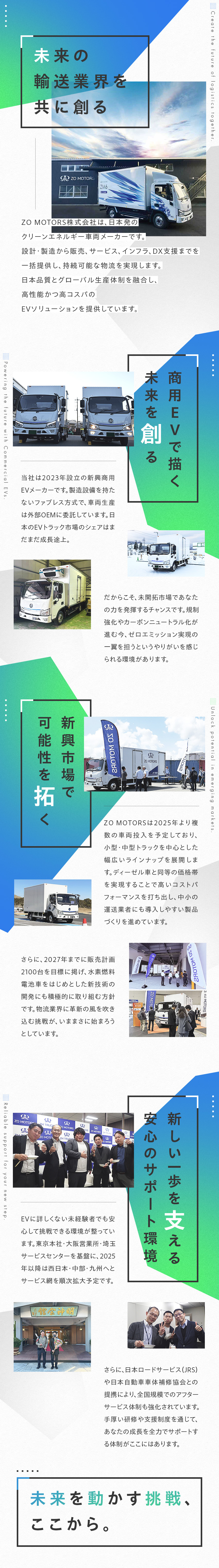 さらに、今後は海外拠点も構え、商用EVの成長市場をグローバルな視野で攻めている点も印象的だ。営業が提案からアフターサポートまで一貫して関わることで、成果を実感しやすい職場だろう。