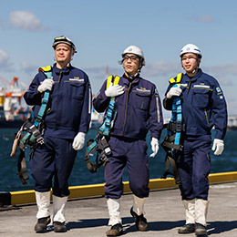 24時間勤務の際、例えば1隻目と2隻目が立て続けに港に着き、動き続けなければならない場合もあります。そんなときは辛さを感じることもあるそう。忙しさから安全面への配慮が欠けてしまうと、大事故に繋がってしまうこともあるため、油断せずに緊張感を持って進めるようにしましょう。もちろん大きな声で声掛けを行うなど、さまざまな工夫を行っておりますが、一人ひとりの意識が大切です。