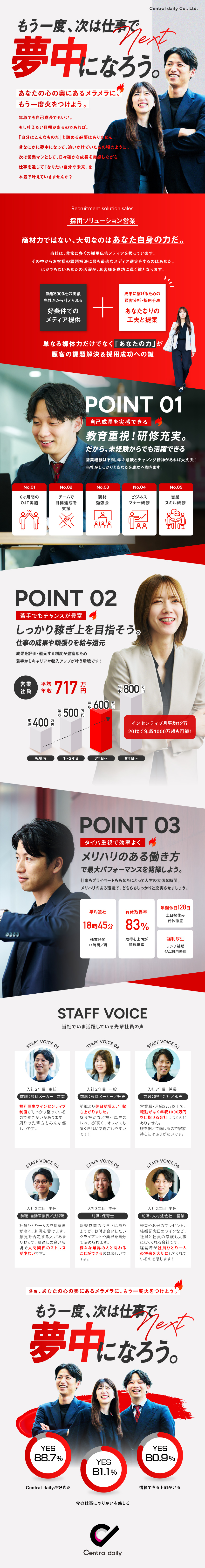 昨今の人材不足の影響から、どの企業も採用課題を抱えています。私たちは、そんな企業の採用をお手伝いをする立場のため、日本の企業を活性化させる一役を担っているとも言えます。また、多数の競合他社がいる中で、自分の提案を選んでもらえたときは、営業としてのやりがいを感じる瞬間です。