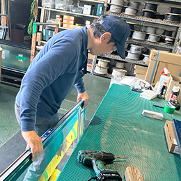 サッシにガラスをはめ込む作業をお任せ。材料の重さは5kg~25kg弱。慣れないうちは軽い材料からお任せします。基本は1人で手作業で組立てていきますが、重い材料は先輩と2~3名体制で行います。