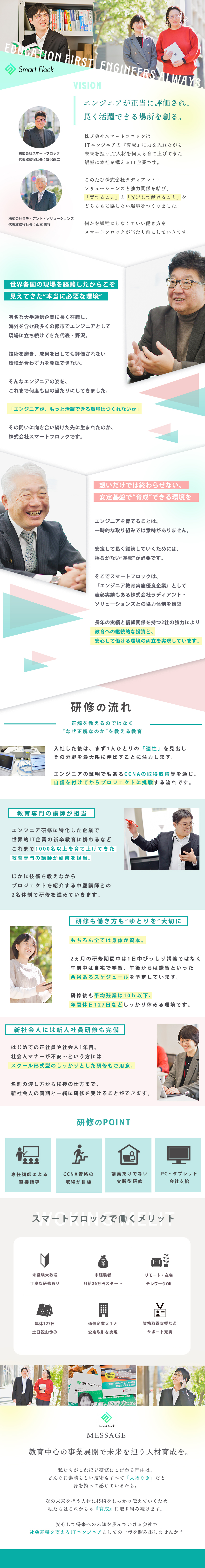 「対面研修」「業界のイロハ」「社会人マナー」など、同期入社社員とともに一から丁寧に指導いたします。業界を一から学びたい、社会人として信頼される人になりたいなど、エンジニアである前に信頼される社会人であって欲しいという想いを大切にしております。