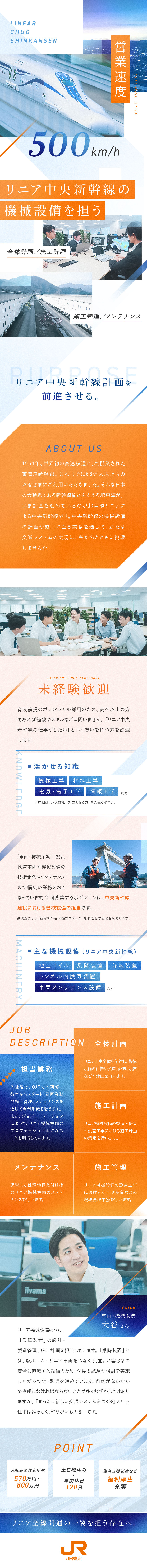 経験やスキルは一切不問。「リニアに関する仕事に挑戦したい」「これまで学んだことを活かしてJR東海で働きたい」 という方は歓迎です。