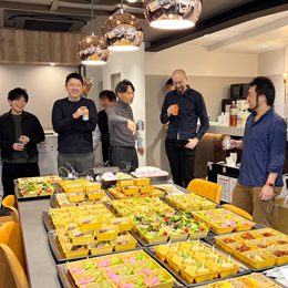 写真は管理部主催の社内交流会の様子!ケータリングメニューなどもメンバー同士で検討しました。