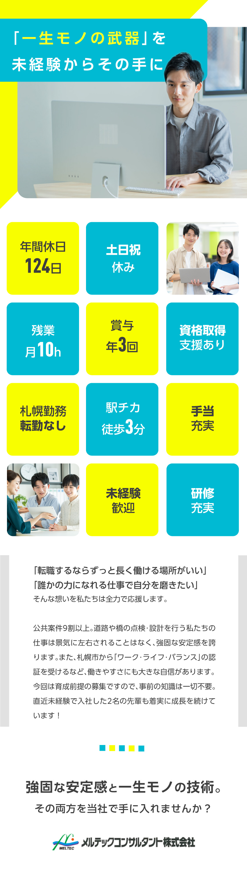 技術職(橋梁等の設計・点検)/土日祝休/賞与年3回/転勤なし