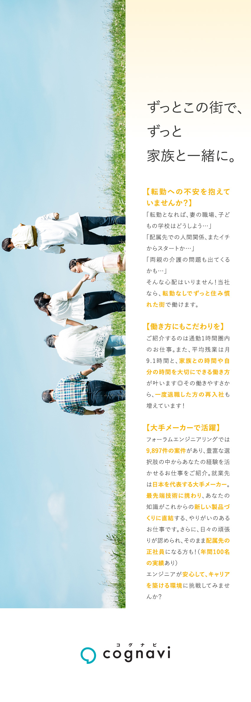 「土日休みの働き方にしたい」「転勤はもうしたくないな」「残業は少なめがよくて…」こういった希望をきちんと聞き入れてくれるのが、フォーラムエンジニアリングの魅力。自分が働く上で大事にしたい条件を叶えつつ、大手メーカーを中心とする優良企業で働けることは、大きなやりがいと満足につながるでしょう。