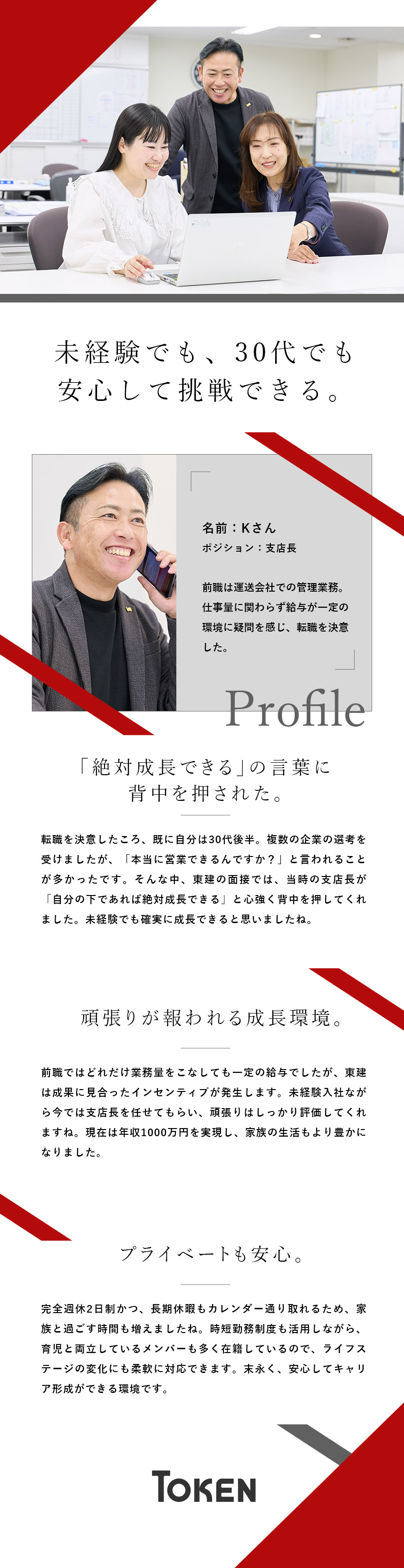 収入アップを実現し、子どもを大学まで行かせたかったため、未経験から挑戦しました。入社後は上司との同行において、言動を見ながら自己分析を重ね、少しずつ建築営業の知識を身につけることができました。