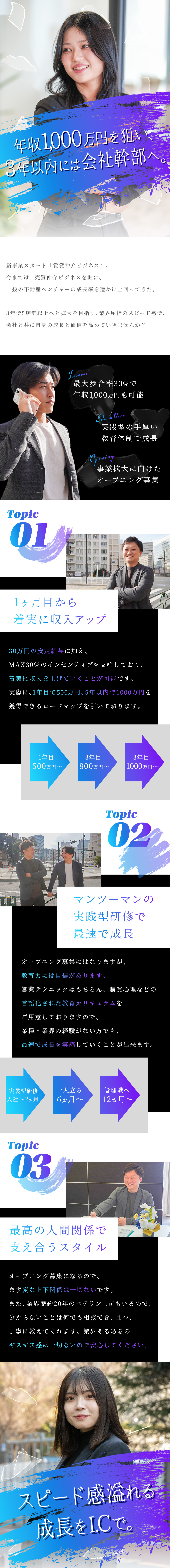 店舗責任者になれば月給50万円程度に加え、インセンティブも支給。実力次第では年収1000万円超も十分に目指せます。