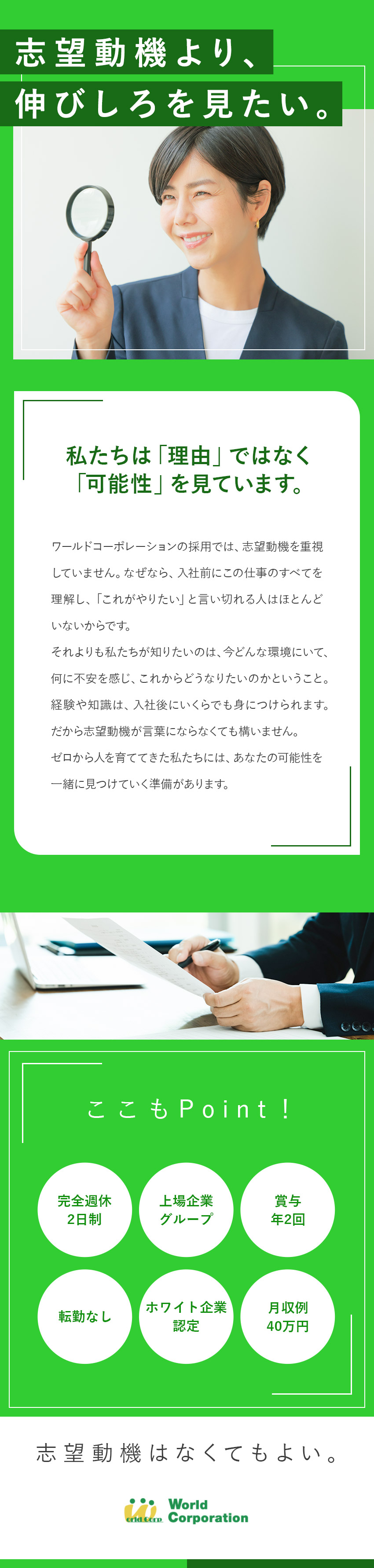 私たちワールドコーポレーションが重視しているのは、面接に来てくれた方の「将来を一緒に考えて、どうすれば良いキャリアが築けるか見つけること」です。 どのようなキャリアを磨いていけばちゃんと将来設計ができるのか、ワールドコーポレーションの中でどういった成長をすればスキルが身につくのかなどを、人事ならではの視点で丁寧にお教えしますし、あなたが納得する未来を一緒に考えていきます。