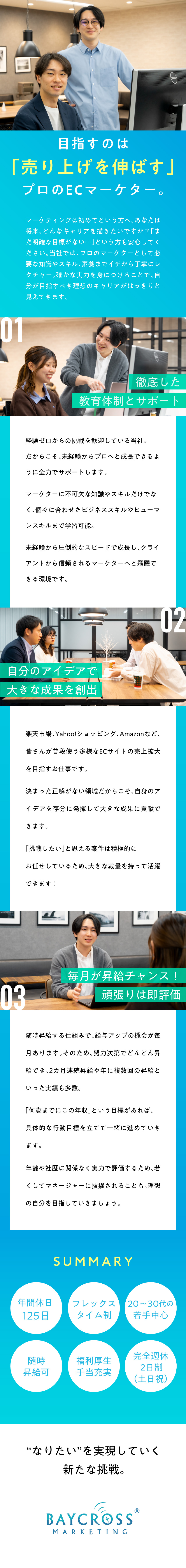 当社では、ECマーケターとして“自分の力で成果を生み出す力”を育てています。広告運用やデータ分析、改善提案等の実務を通じて、一歩ずつ着実に信頼して仕事を任される存在へ成長できます。
