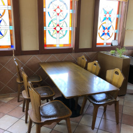 ステンドグラスにカフェテーブル。優雅な気持ちで仕事に取り組める環境です。