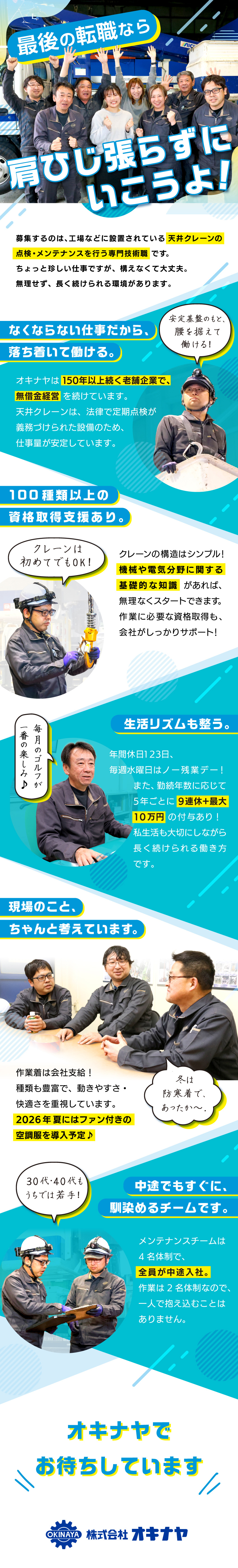 天井クレーンの点検・修理メンテナンス/年休123日/転勤なし