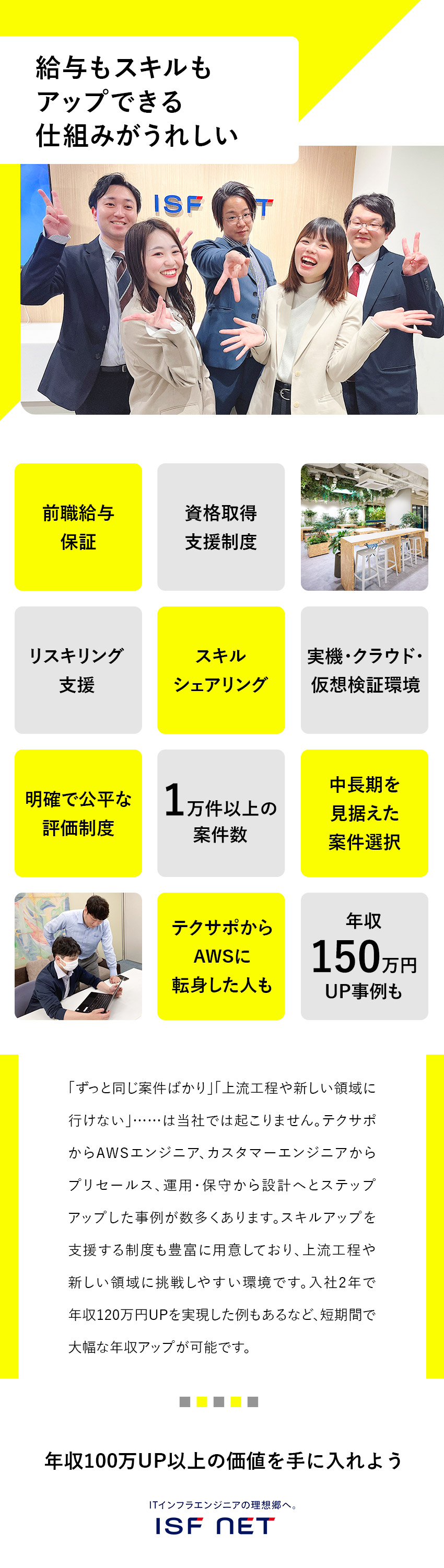 「スキルだけあればいい」では活躍が難しいのがアイエスエフネット。企業理念にもあるように「人間力」が求められ、対人スキルも重要な要素です。技術と対人スキルと総合的な力が必要です。また、キャリアパスが豊富なので、自分のしたいことが明確な方が活躍しています。