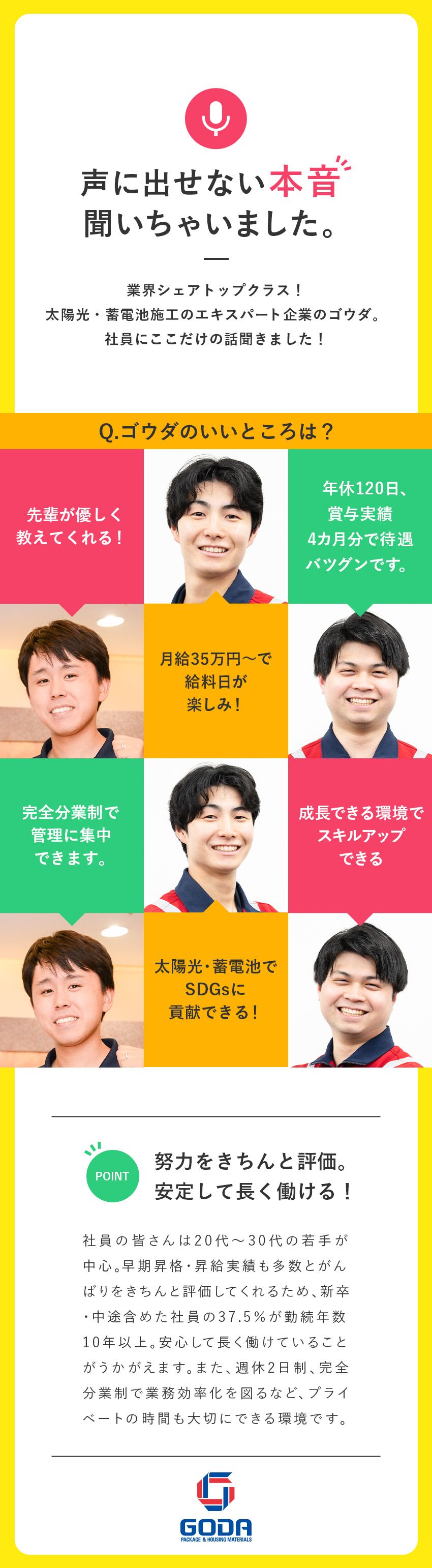創エネに貢献!施工管理/月給35万円~/年休120日/分業制