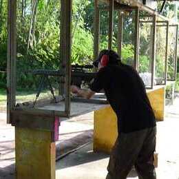 社員研修!海外の特殊射撃場にて、社員自ら防弾ガラスの性能テストをしています。