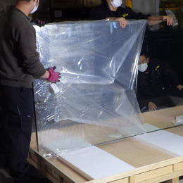 特大サイズの重たいガラスなら、8~10名で協力し息を合わせながら行います。