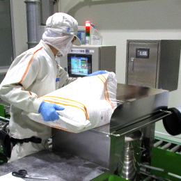 <計量の流れ>【1】原料の入った袋を機械で ⇒